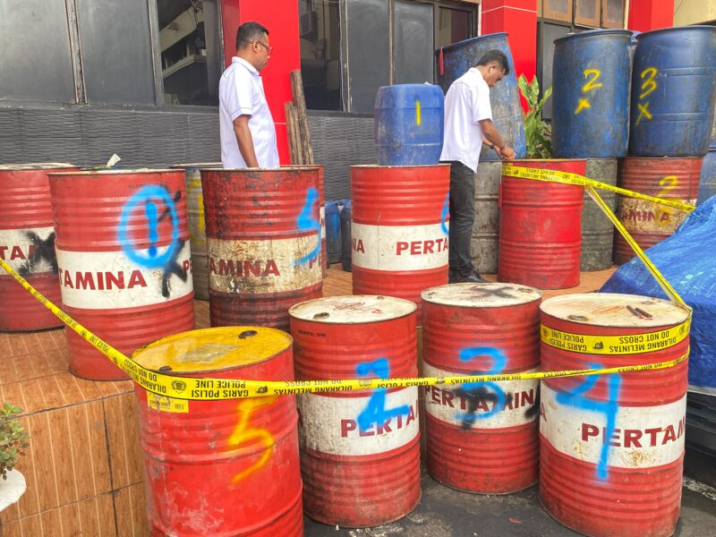 Dari lokasi kejadian, polisi mengamankan sejumlah barang bukti, di antaranya ribuan liter BBM yang tersimpan dalam drum dan jeriken, mesin pompa, selang, kendaraan operasional, serta dokumen pendukung lainnya.