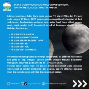 “Kedua fenomena ini secara gravitasi meningkatkan ketinggian pasang air laut ke level maksimum,”jelas BMKG Stasiun Meteorologi Maritim Ambon melalui laporan resmi lembaga tersebut.
