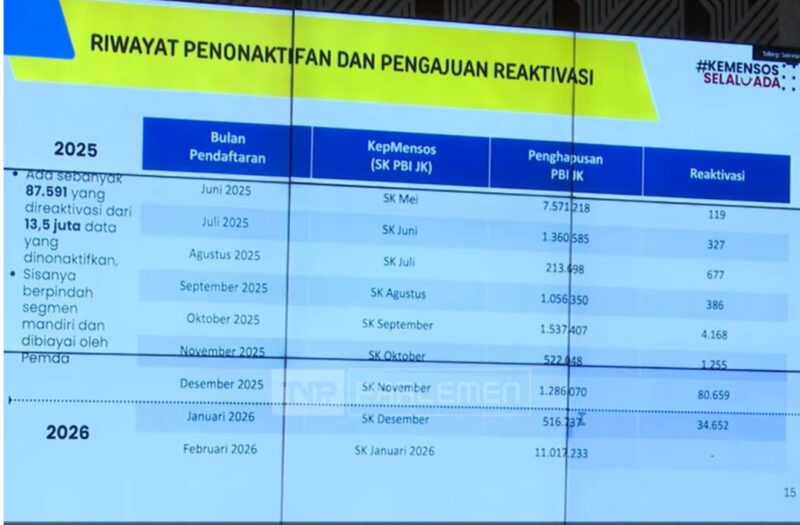 Dalam proses tersebut, Kemensos menonaktifkan 13,5 juta peserta PBI JKN pada 2025. Dari jumlah itu, sebanyak 87.591 peserta mengajukan reaktivasi.